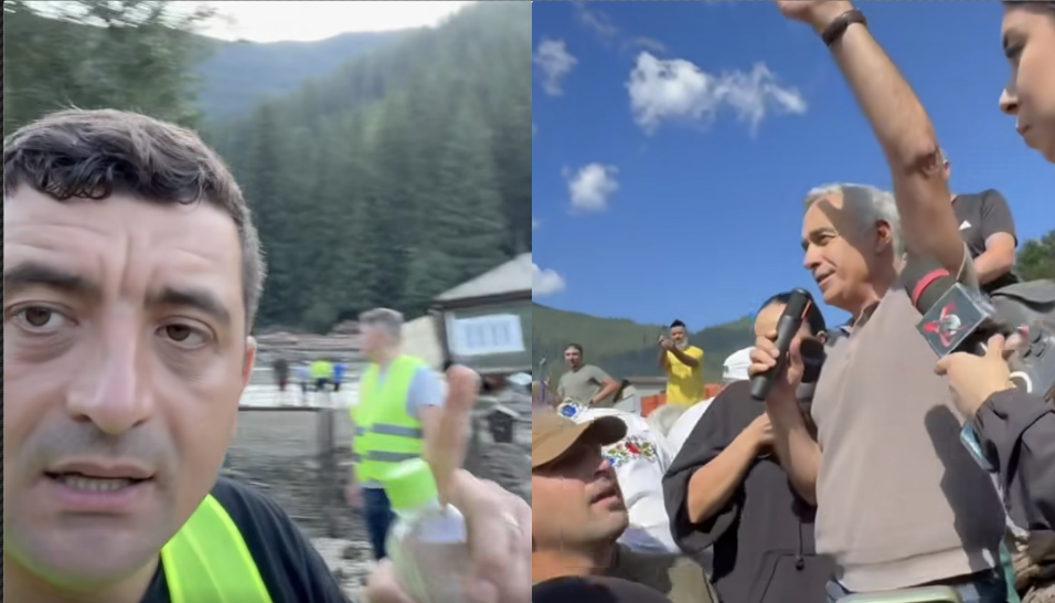 Deși Călin Georgescu anunțase încă de miercuri că va ajunge la finalul săptămânii în Broșteni, George Simion a ajuns primul, încă de joi. Cei doi au venit separat, fiecare cu propria echipă, și nu s-au afișat împreună pe străzile afectate de inundații. Niciunul nu a pomenit, în intervențiile publice, vreun cuvânt despre celălalt.