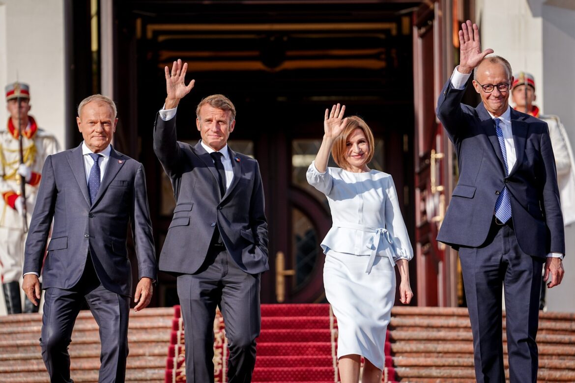 Președintele francez, Emmanuel Macron, cancelarul german Friedrich Merz și premierul polonez Donald Tusk și-au exprimat miercuri, la Chișinău, sprijinul pentru aderarea Republicii Moldova în Uniunea Europeană. Cei trei lideri europeni au fost întâmpinați de Maia Sandu la sediul Președinției Republicii Moldova, cu ocazia celebrărilor dedicate sărbătoririi a 34 de ani de la declararea independenței Republicii Moldova. Considerată deosebit de vulnerabilă după invazia rusă în Ucraina vecină, Republica Moldova se pregăteşte luna viitoare de un scrutin legislativ crucial pentru parcursul său proeuropean.